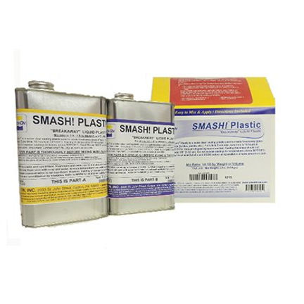 Smash! Plastic ™ es un nuevo plástico líquido de uretano diseñado para romperse / desmoronarse con el impacto ("vidrio separable"). Smash! Plastic ™ es transparente como el agua y una vez que está completamente curado, se rompe como el vidrio. Puede moldearse sólido en secciones delgadas para hacer cristales de ventana o moldearse rotacionalmente para formar botellas huecas, frascos u otros objetos similares al vidrio para usar como accesorios rompibles para producciones cinematográficas y teatrales. El grosor máximo recomendado es de 1/8 "(0,33 cm).